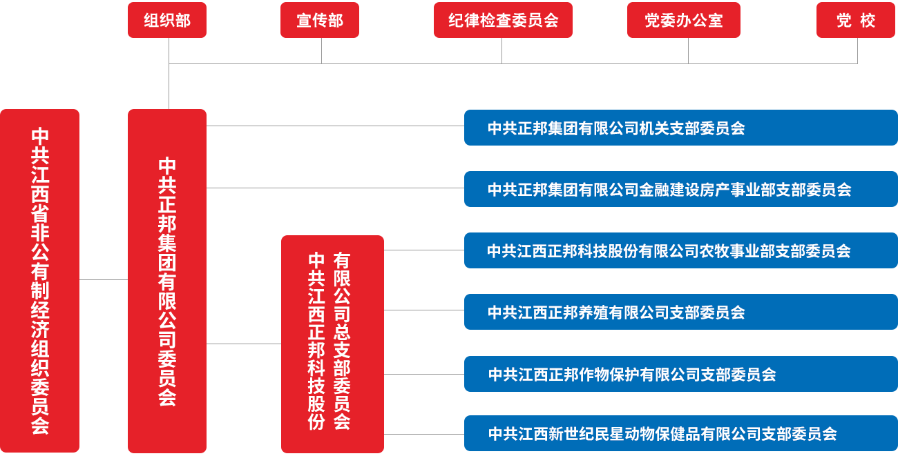 中共正邦集團(tuán)有限公司委員會(huì)成立于2009年11月,隸屬于江西省非公有制經(jīng)濟(jì)組織黨委,是江西第一個(gè)民營(yíng)企業(yè)黨組織。正邦集團(tuán)董事長(zhǎng)、總裁林印孫擔(dān)任集團(tuán)黨委書記,集團(tuán)現(xiàn)有黨員1623人。集團(tuán)黨委按照“一方所屬、雙重管理”的模式,直屬下轄1個(gè)黨總支、6個(gè)黨支部,對(duì)集團(tuán)旗下分布在全國(guó)各地的各分、子公司16個(gè)黨支部實(shí)行雙重管理。